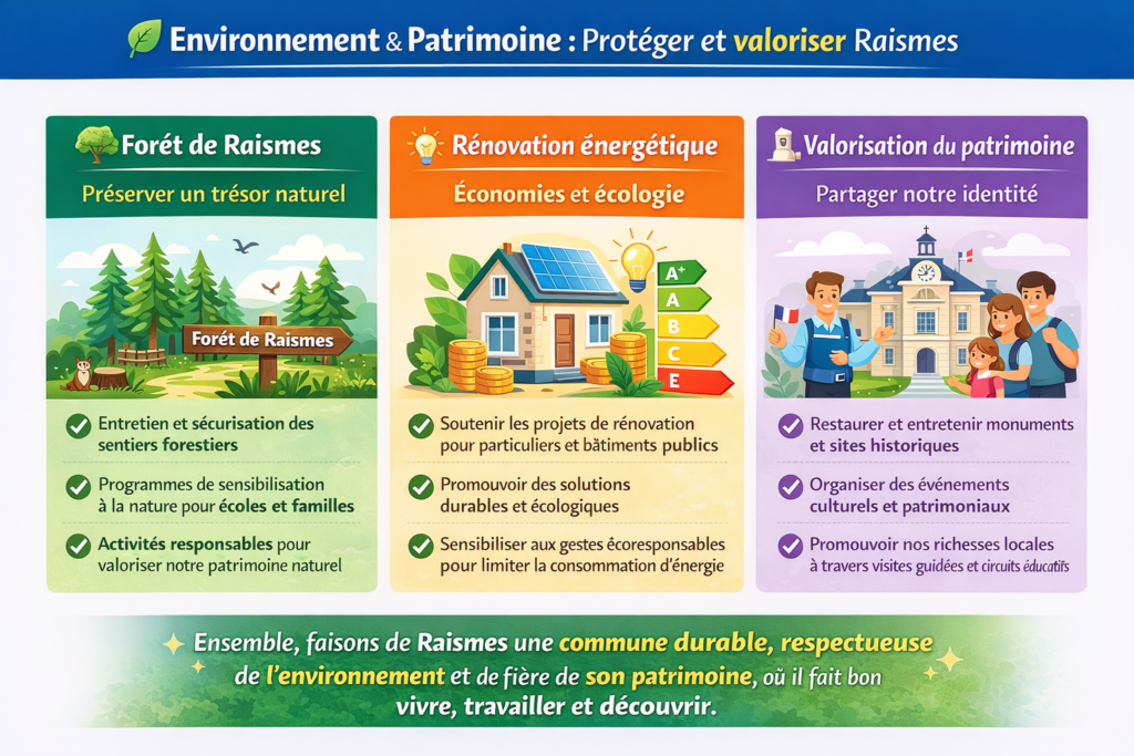 ✨ Ensemble, faisons de Raismes une commune durable, respectueuse de l’environnement et fière de son patrimoine, où il fait bon vivre, travailler et découvrir.